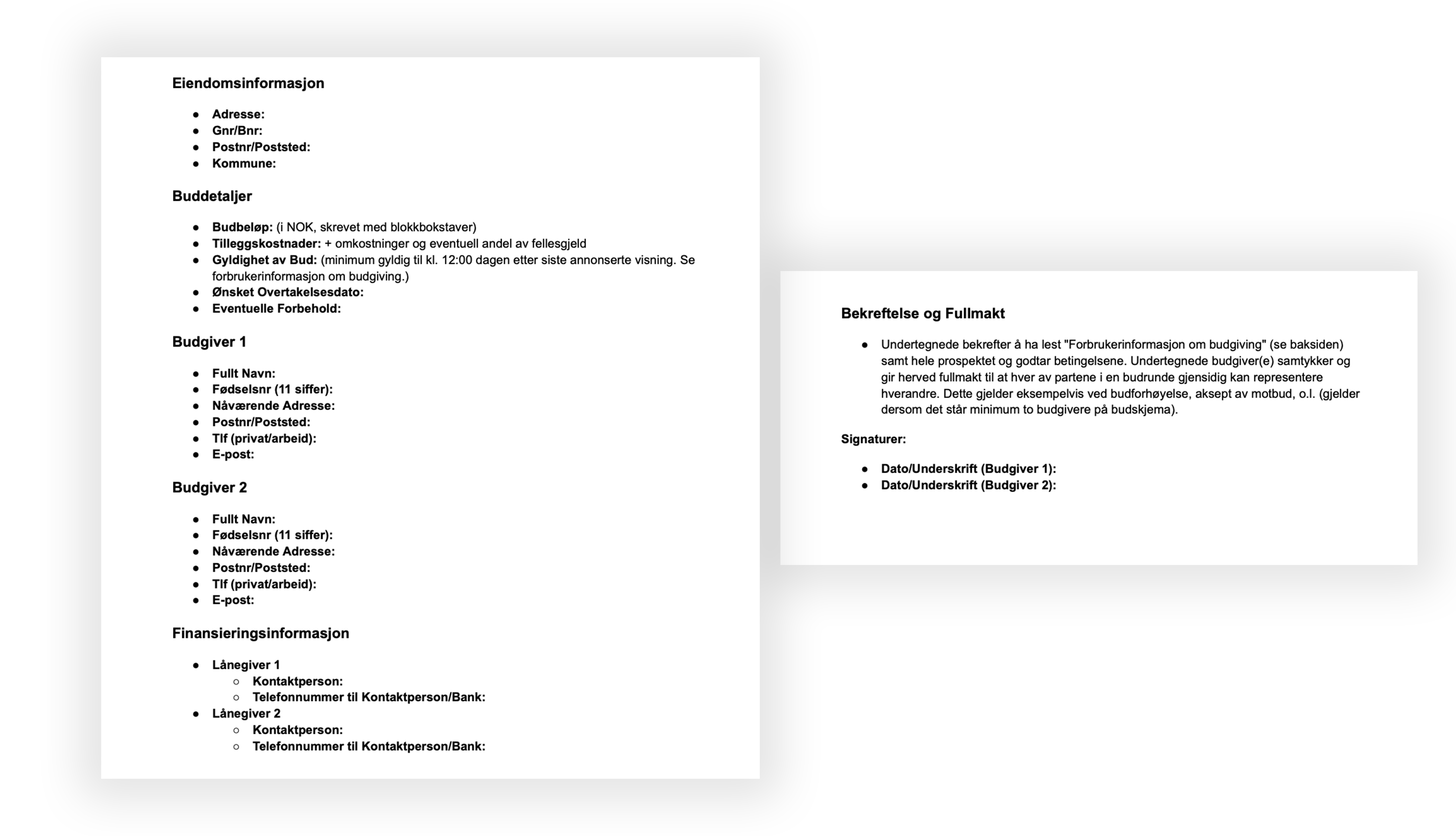 Hvordan fungerer en budrunde? Budskjemaet følger ofte med i prospektet som du får av eiendomsmegler på visning, eller fått tilsendt i etterkant, og inneholder informasjon om ditt bud.